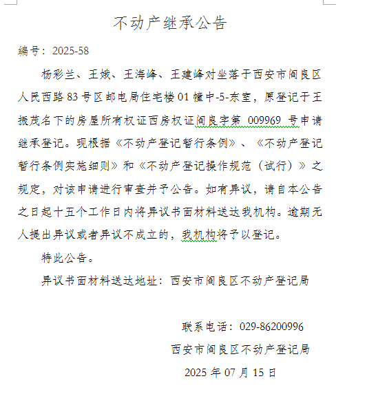 不动产继承公告 编号:2025-58