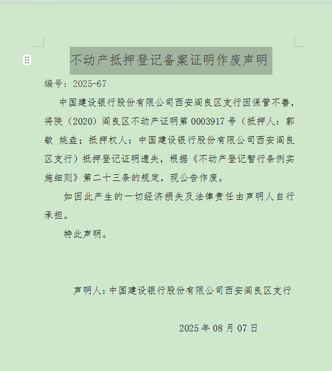 不动产抵押登记备案证明(编号:2025 - 67)作废声明