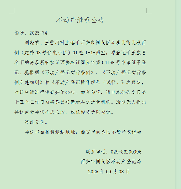 不动产继承公告 编号:2025-74