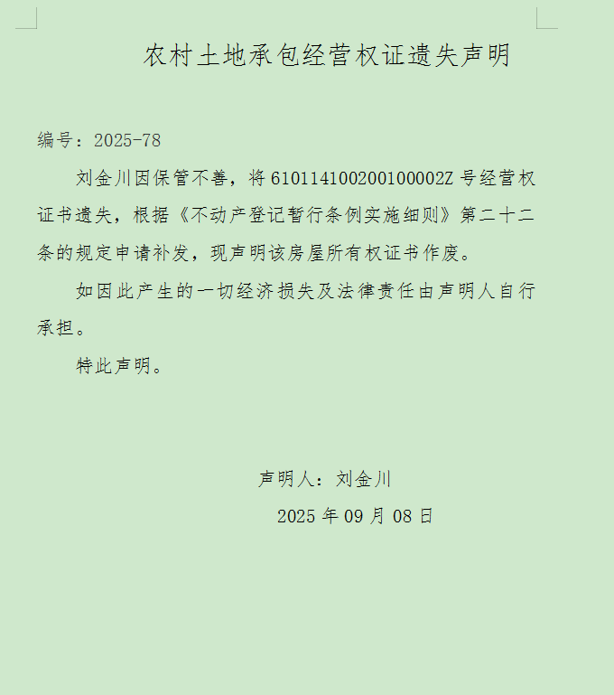 农村土地承包经营权证遗失声明,编号为2025 - 78