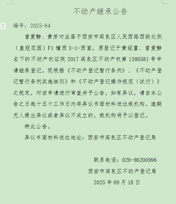不动产继承公告 编号:2025-84