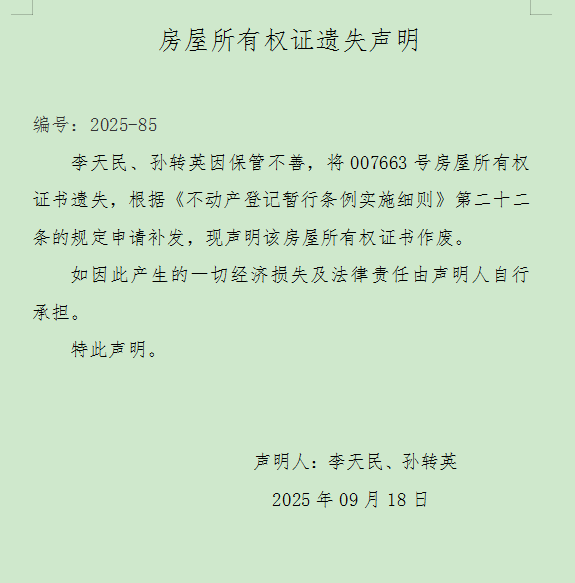 房屋所有权证遗失声明,编号为2025 - 85