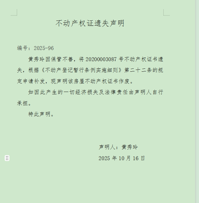 不动产权证遗失声明 编号:2025-96