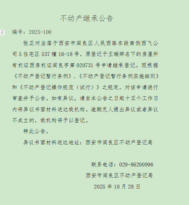 不动产继承公告 编号:2025-100