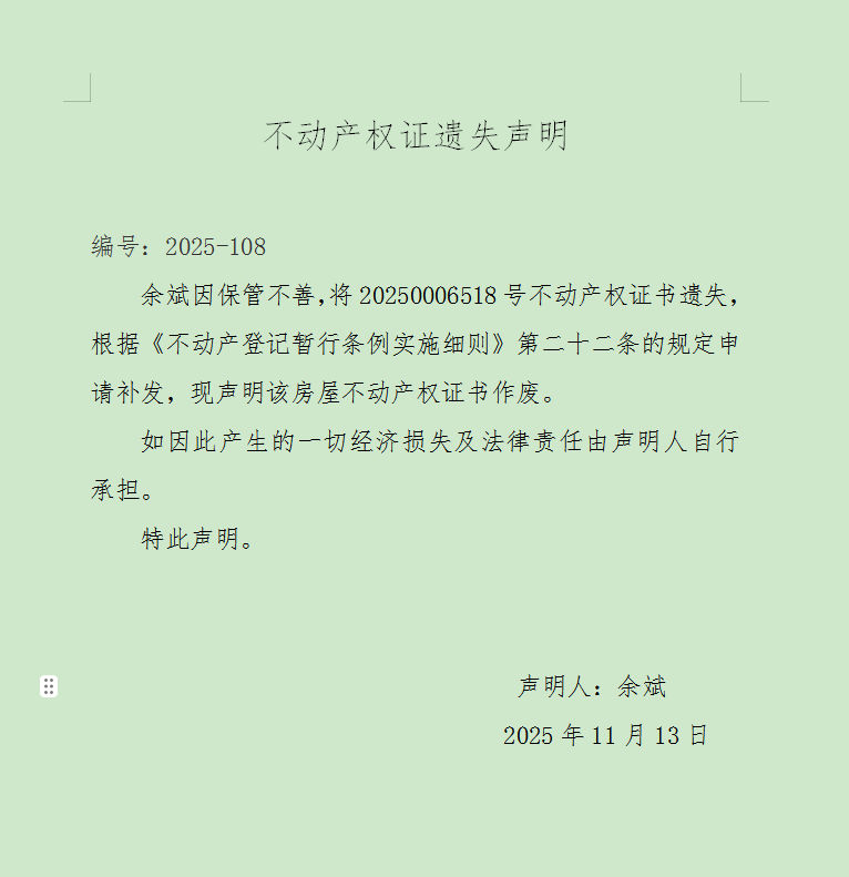 不动产权证遗失声明 编号:2025-108