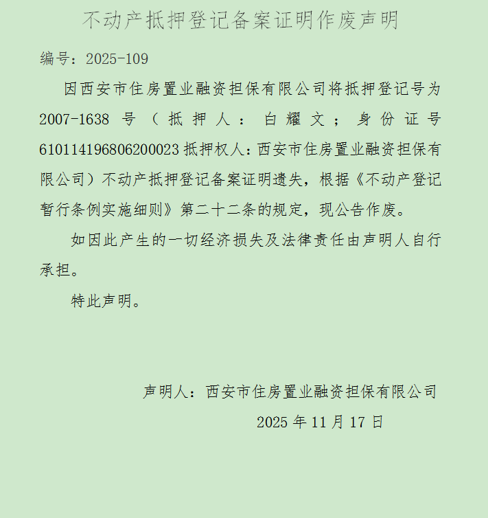 不动产抵押登记备案证明(编号:2025 - 109)作废声明