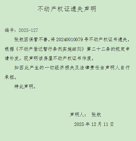 不动产权证遗失声明 编号:2025-127