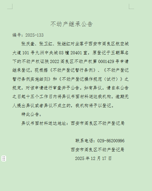 不动产继承公告 编号:2025-133