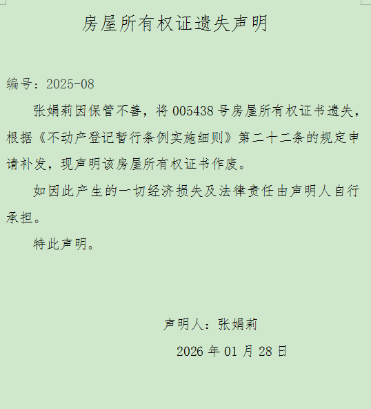 房屋所有权证遗失声明 编号:2025-08