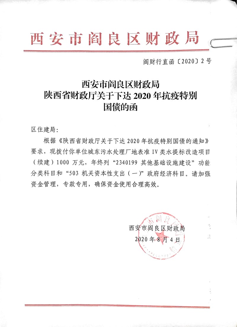 西安市阎良区财政局关于下达2020年抗议特别国债的函(1000万)