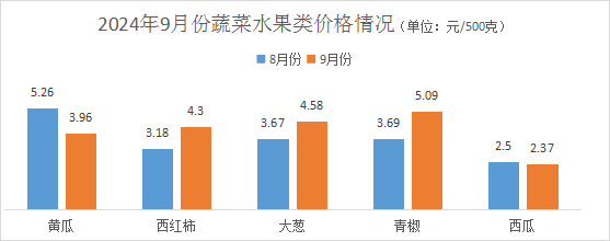 本月,蔬菜类价格以涨幅为主,与上月相比:黄瓜价格每500克均价3.96元,环比降幅24.71%;西红柿价格每500克均价4.3元,环比涨幅35.06%;大葱价格每500克均价4.58元,环比涨幅24.89%;青椒价格每500克均价5.09元,环比涨幅38.03%。水果类价格以降幅为主,以西瓜为例,西瓜价格每500克均价2.37元,环比降幅5.33%。