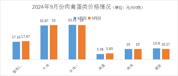 本月,猪肉(去骨后腿肉)价格每500克均价17.67元,环比涨幅2.94%;牛肉(去骨后腿肉)价格每500克均价33元,环比涨幅1.01%;羊肉(去骨后腿肉)价格每500克均价33元,环比降幅0.99%;新鲜完整鸡蛋价格每500克均价5.83元,环比涨幅8.33%;鸡肉价格每500克均价10元,环比持平;鲤鱼价格每500克均价10.27元,环比降幅5.81%;牛奶、香烟、啤酒价格基本持平。