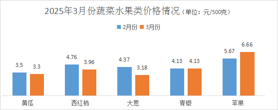 本月,蔬菜类价格涨跌互现,与上月相比:黄瓜价格每500克均价3.3元,环比降幅5.71%;西红柿价格每500克均价3.96元,环比降幅16.81%;大葱价格每500克均价3.18元,环比降幅27.23%;青椒价格每500克均价4.13元,环比持平。水果类价格涨幅为主,以苹果为例,苹果价格每500克均价6.66元,环比涨幅17.46%。