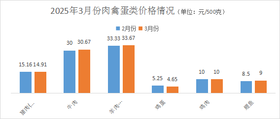 本月,猪肉(去骨后腿肉)价格每500克均价14.91元,环比降幅1.65%;牛肉(去骨后腿肉)价格每500克均价30.67元,环比涨幅2.23%;羊肉(去骨后腿肉)价格每500克均价33.67元,环比涨幅1.02%;新鲜完整鸡蛋价格每500克均价4.65元,环比降幅11.43%;鸡肉价格每500克均价10元,环比持平;鲤鱼价格每500克均价9元,环比涨幅5.88%;牛奶、香烟、啤酒价格基本持平。