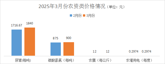 农资类价格略有浮动。其中尿素均价1840元/吨,环比涨幅7.18%;碳酸氢氨均价900元/吨,环比涨幅2.86%;农膜均价12元/公斤(国产幅宽4米),环比持平;农灌用电价格每度0.2974元,环比持平。