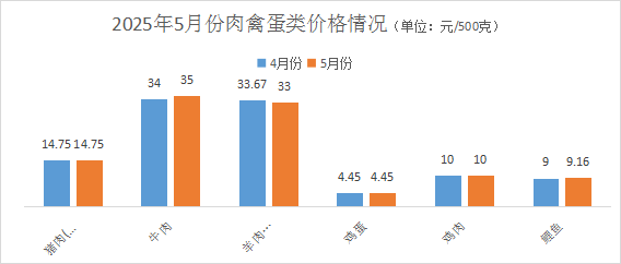 本月,猪肉(去骨后腿肉)价格每500克均价14.75元,环比持平;牛肉(去骨后腿肉)价格每500克均价35元,环比涨幅2.94%;羊肉(去骨后腿肉)价格每500克均价33元,环比降幅1.99%;新鲜完整鸡蛋价格每500克均价4.45元,环比持平;鸡肉价格每500克均价10元,环比持平;鲤鱼价格每500克均价9.16元,环比涨幅1.78%。
