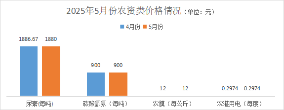 农资类价格略有浮动。其中尿素均价1880元/吨,环比降幅0.35%;碳酸氢氨均价900元/吨,环比持平;农膜均价12元/公斤(国产幅宽4米),环比持平;农灌用电价格每度0.2974元,环比持平。