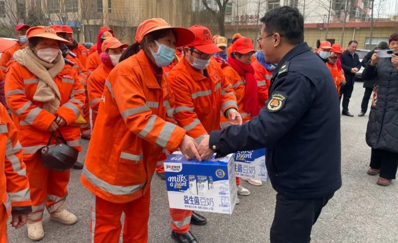 看到广大环卫工人冒着大雪严寒,不分昼夜辛苦劳作,1月19日下午,阎良区城管执法局联合西安逸德商贸有限责任公司,组织开展“情系环卫工 冬日送温暖”慰问活动,为奋战在工作一线的环卫工人送去400余箱益生菌豆奶,希望能在寒冷的冬日带给他们一丝温暖。