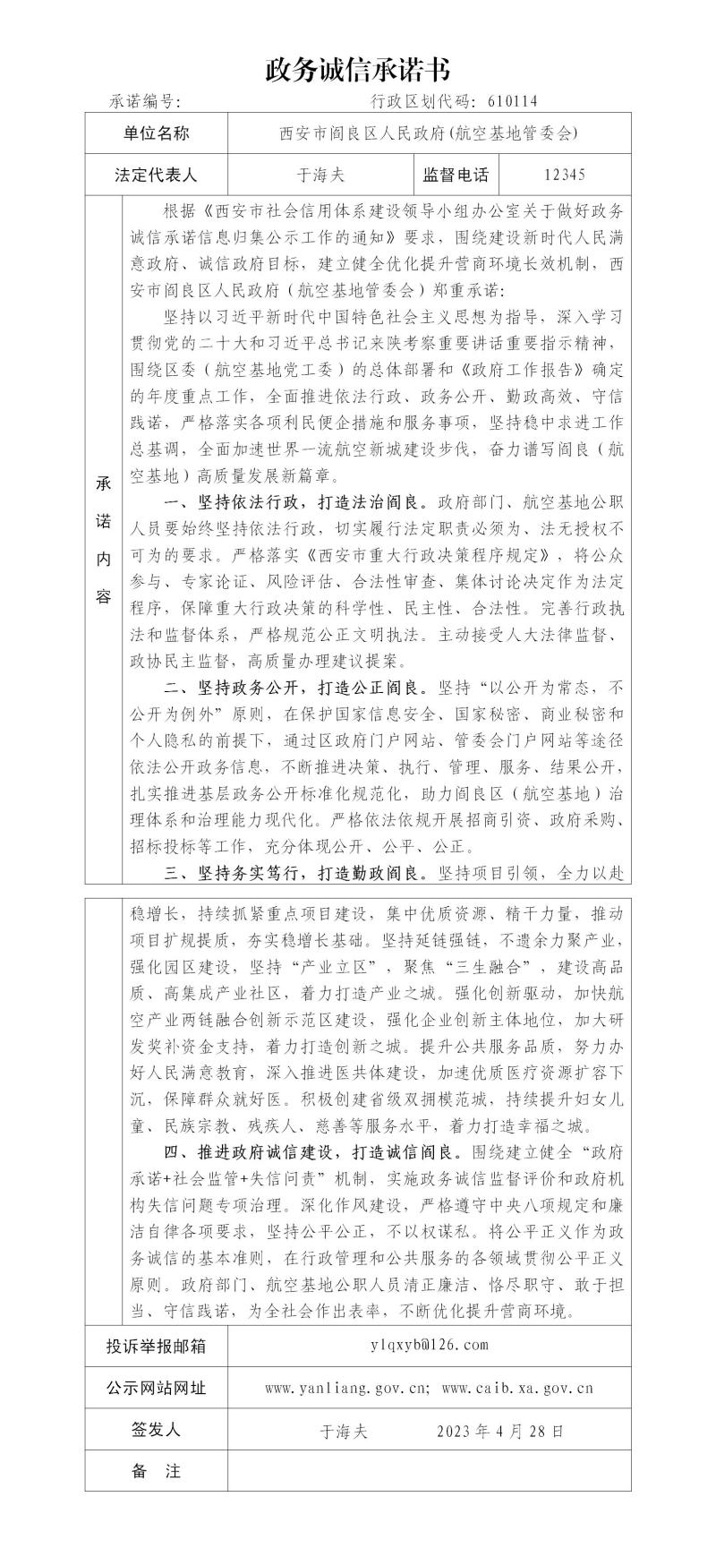 西安市阎良区人民政府(航空基地管委会)政务诚信承诺书