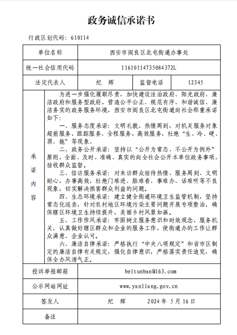阎良区北屯街道办事处政务诚信承诺书