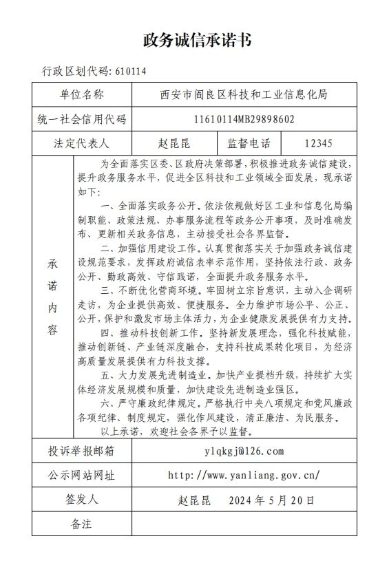 阎良区科技和工业信息化局政务诚信承诺书