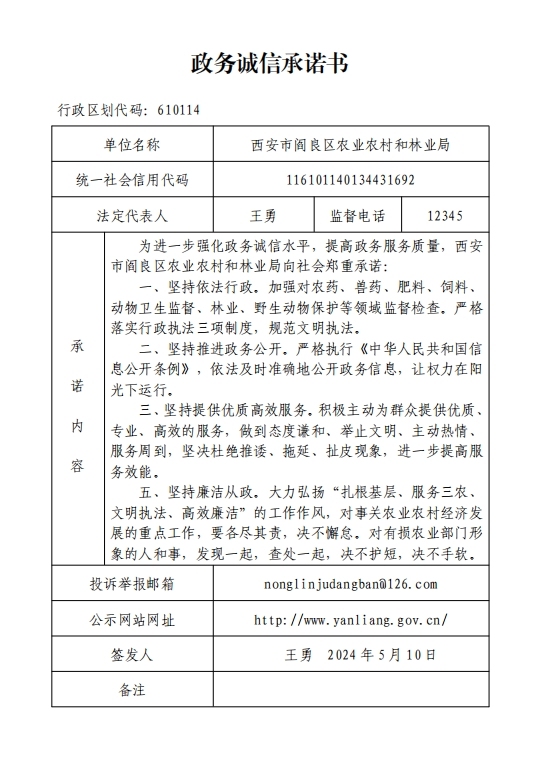阎良区农业农村和林业局政务诚信承诺书