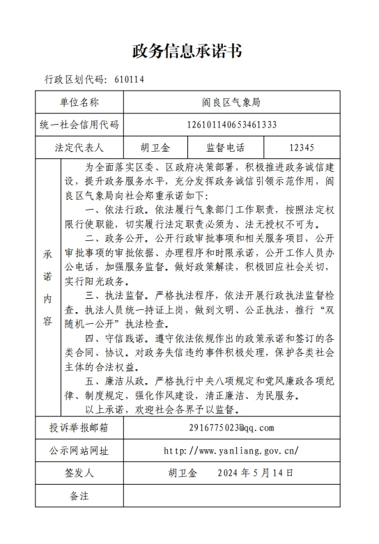 阎良区气象局政务诚信承诺书