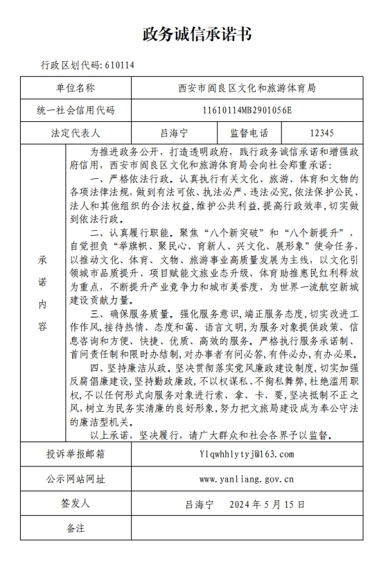 阎良区文化和旅游体育局政务诚信承诺书