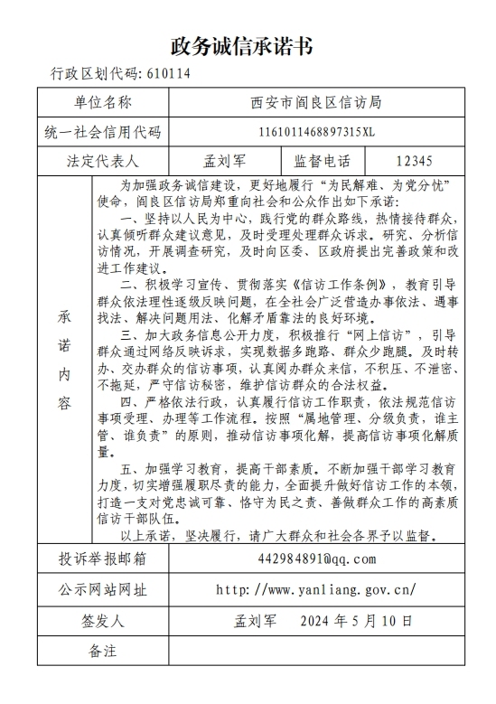 阎良区信访局政务诚信承诺书
