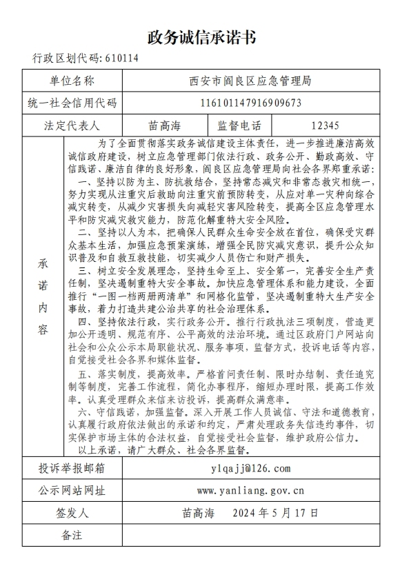 阎良区应急管理局政务诚信承诺书