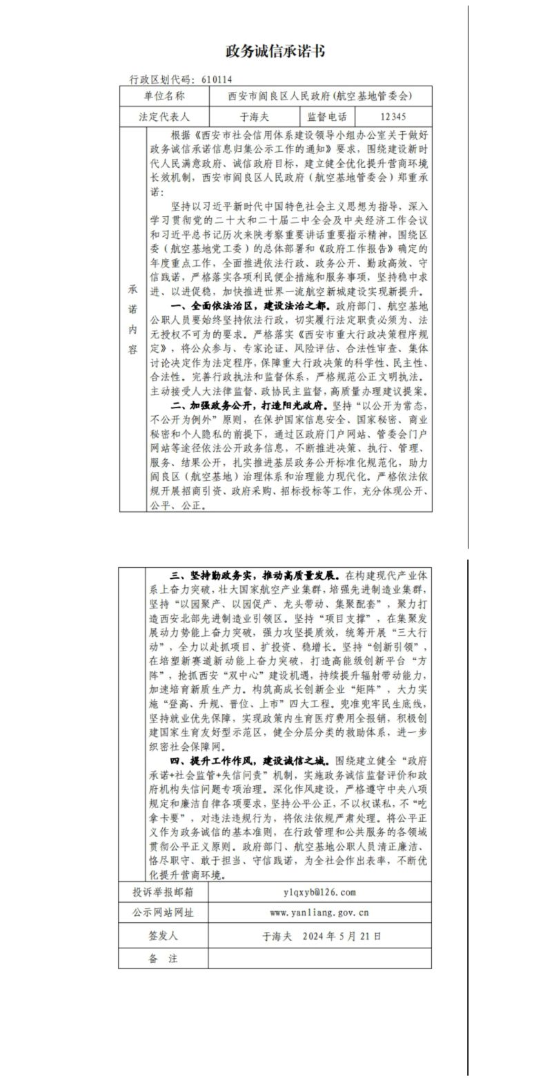 阎良区人民政府(航空基地管委会)政务诚信承诺书