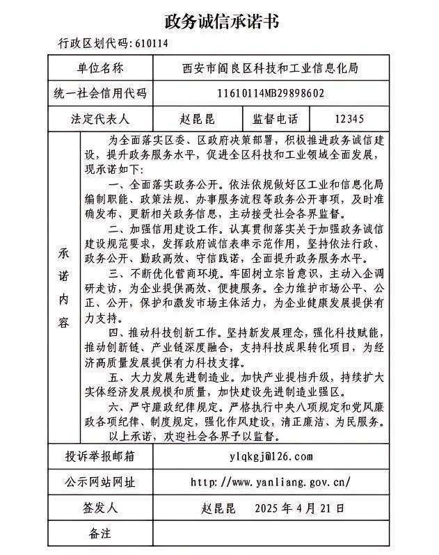 阎良区科技和工业信息化局发布政务诚信承诺书