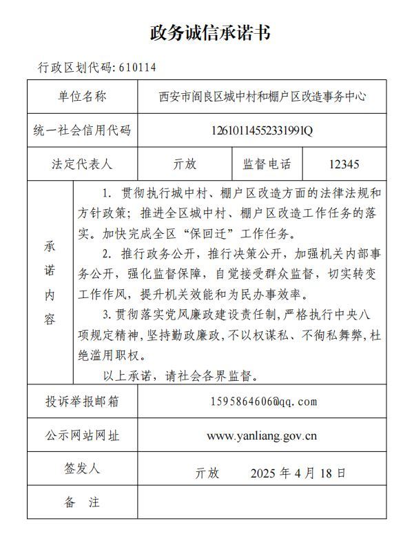 阎良区城中村和棚户区改造事务中心发布政务诚信承诺书