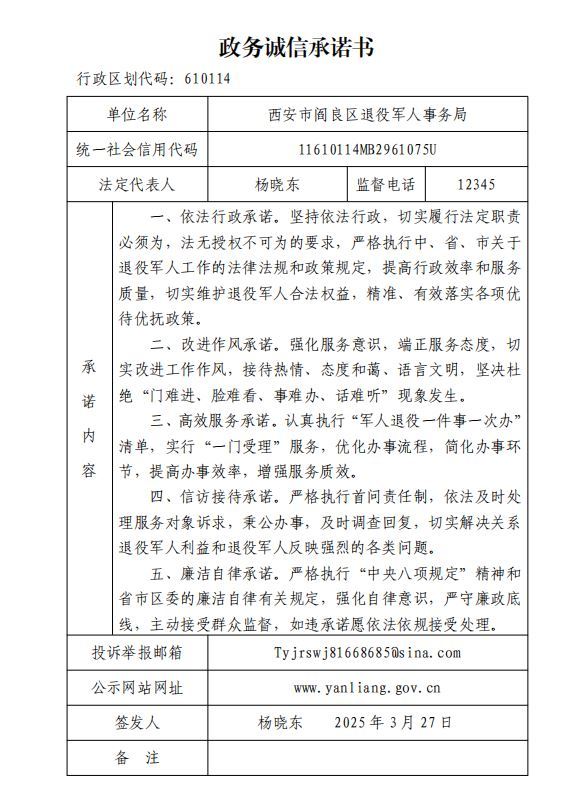 阎良区退役军人事务局发布政务诚信承诺书