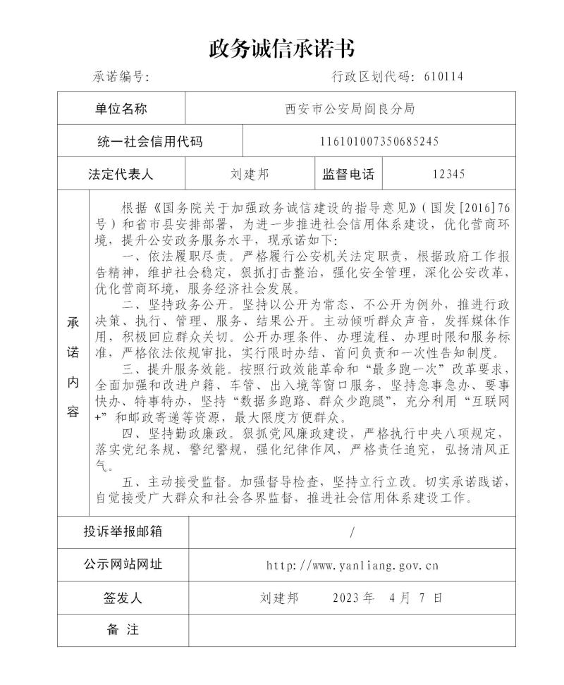 西安市公安局阎良分局政务诚信承诺书