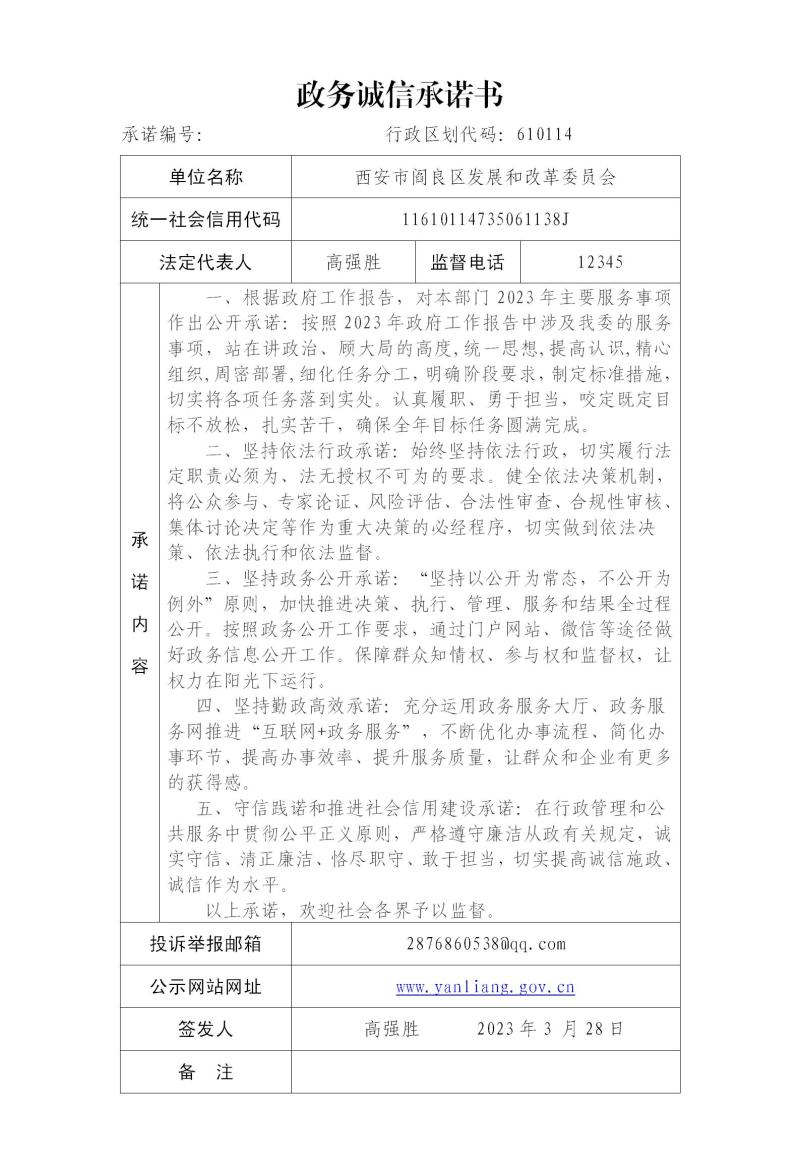 西安市阎良区发展和改革委员会政务诚信承诺书