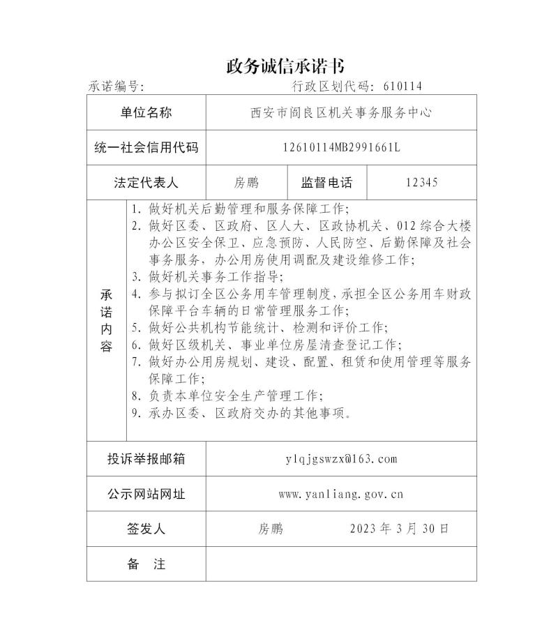 西安市阎良区机关事务服务中心政务诚信承诺书
