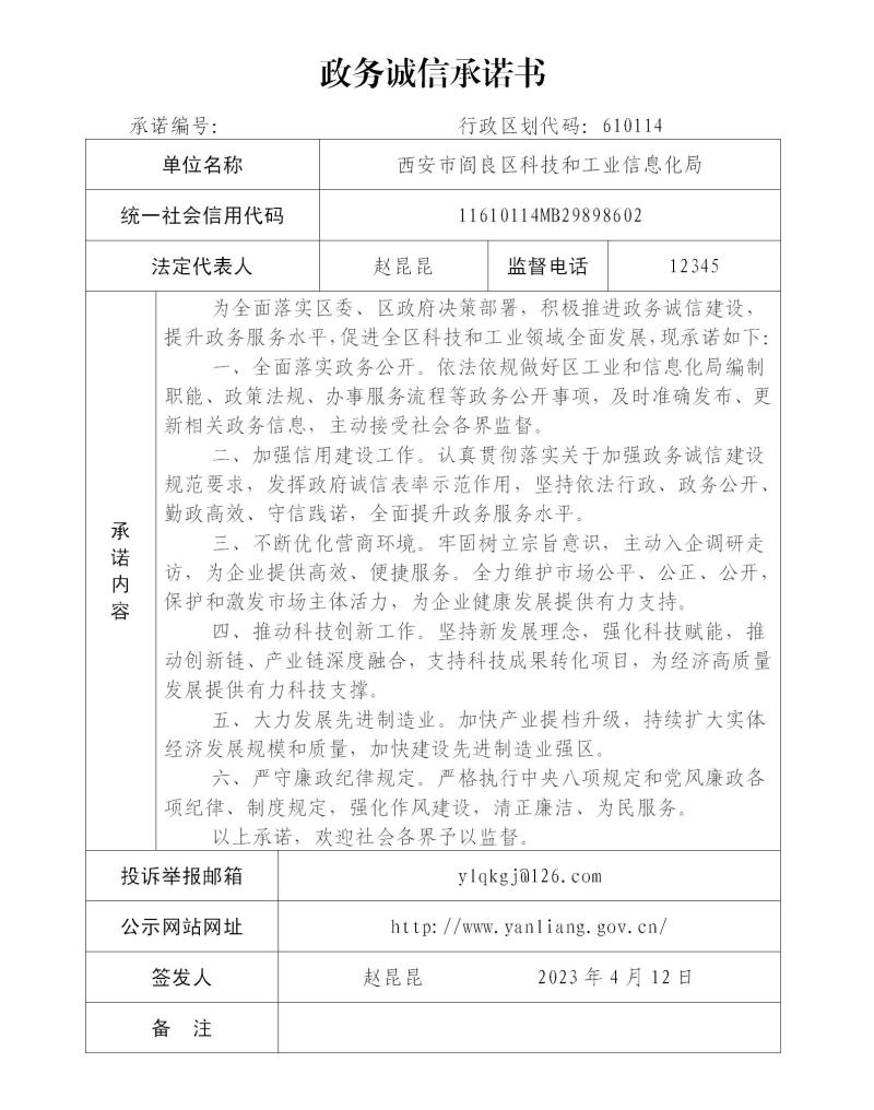 西安市阎良区科技和工业信息化局政务诚信承诺书