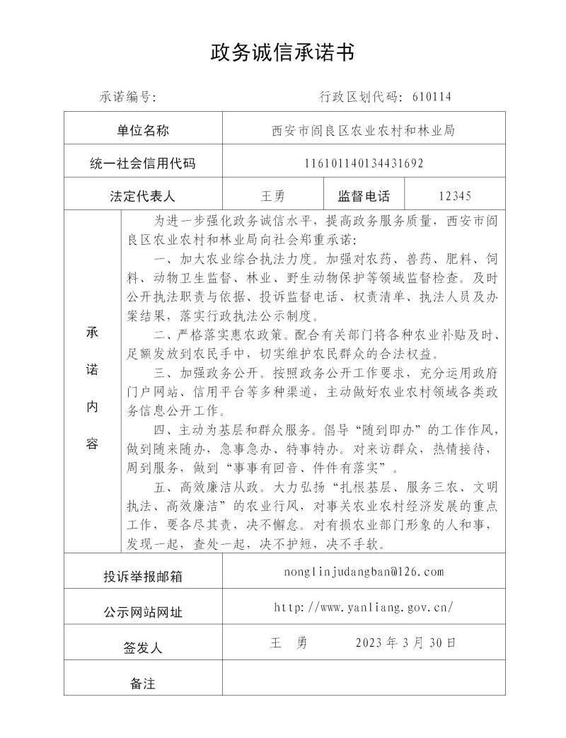 西安市阎良区农业农村和林业局政务诚信承诺书