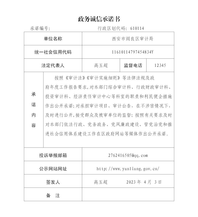 西安市阎良区审计局政务诚信承诺书