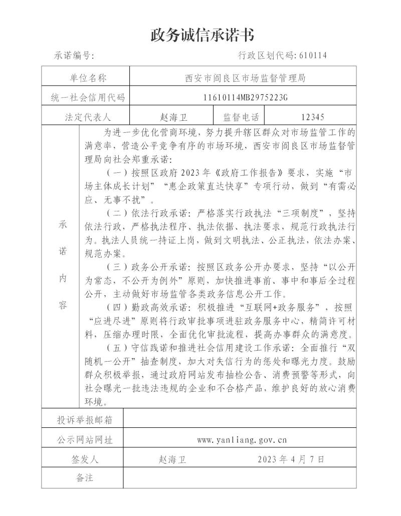 西安市阎良区市场监督管理局政务诚信承诺书