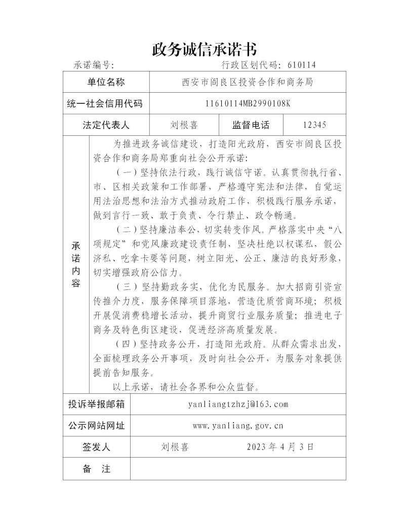 西安市阎良区投资合作和商务局政务诚信承诺书