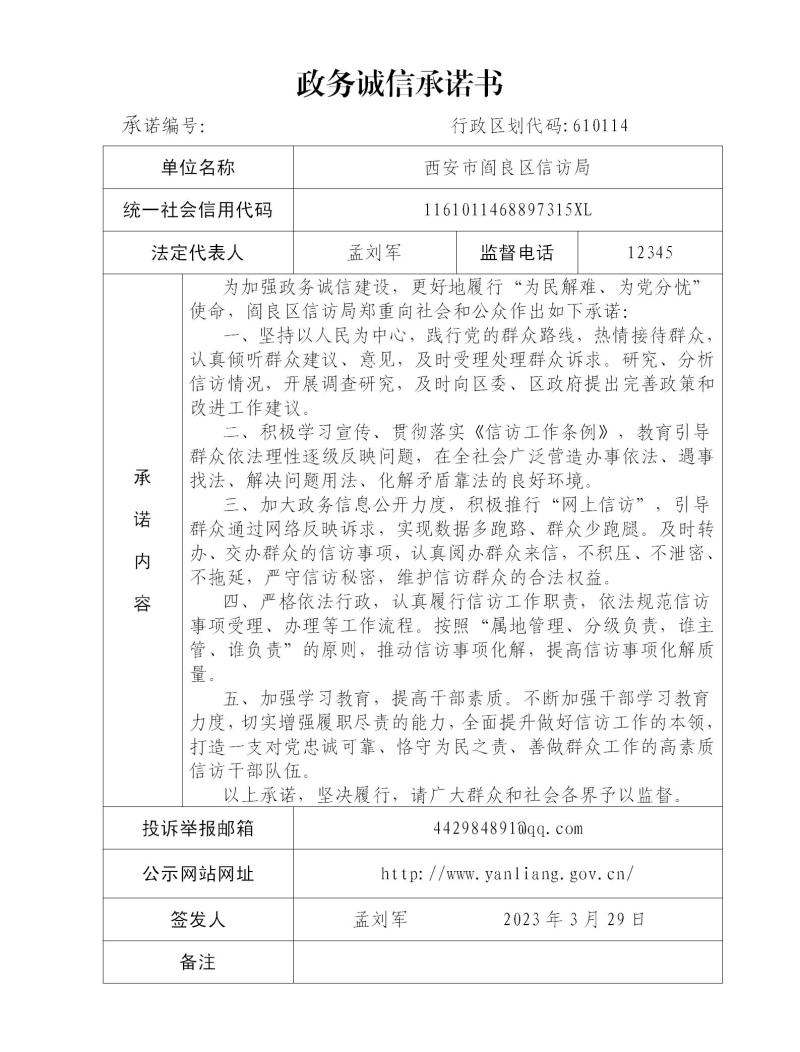 西安市阎良区信访局政务诚信承诺书