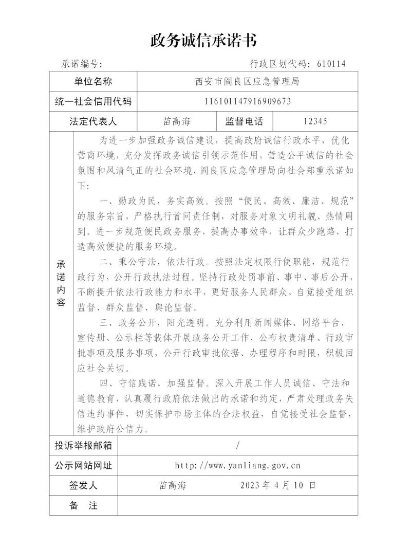 西安市阎良区应急管理局政务诚信承诺书