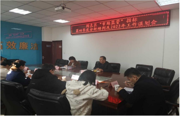 7、为深入推进深化“放管服”改革和优化营商环境工作,谋划2022年工作思路,11月11日下午,区市场监管局牵头组织区司法局、区科工局、区数据信息中心、区交通局、区农业农村局、区文旅局分管领导和科室负责人召开阎良区优化营商环境“市场监管”指标第四季度分析研判及2022年工作谋划会。