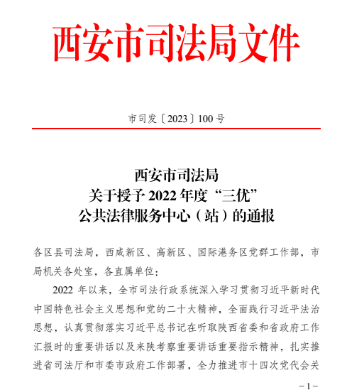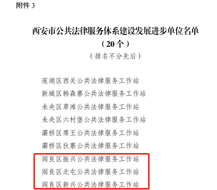 8月4日,西安市司法局召开全市公共法律服务体系建设暨标准化服务年工作推进会,会上宣布了《关于授予2022年度“三优”公共法律服务中心(站)的通报》,阎良区公共法律服务中心荣获西安“三优”公共法律服务中心荣誉称号,阎良区振兴、北屯、新兴公共法律服务工作站荣获西安市公共法律服务体系建设发展进步单位。